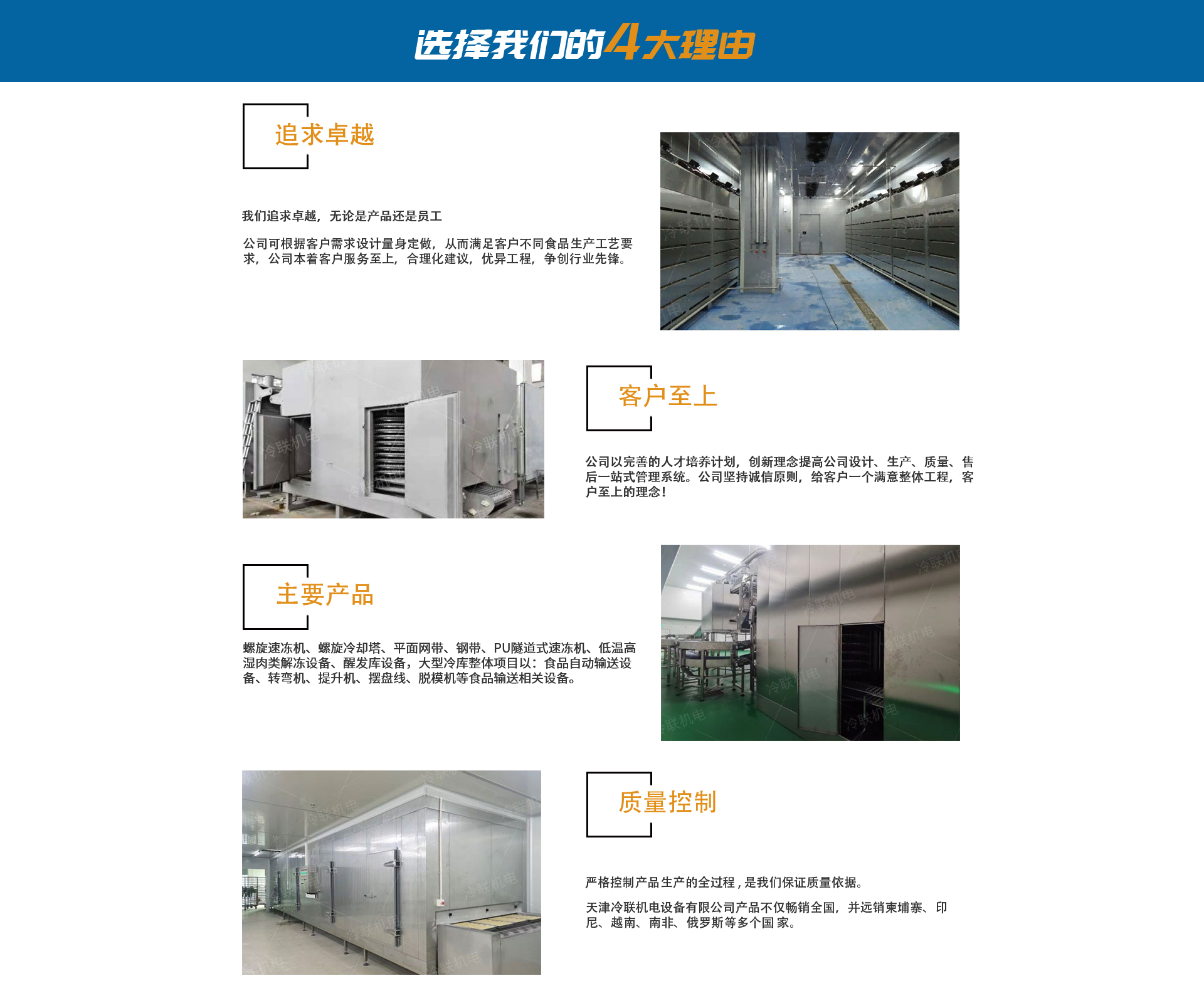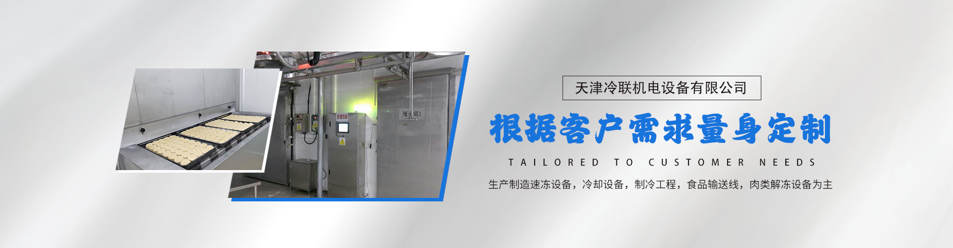天津冷聯機電設備有限公司,是集科研、設計、制造、安裝、售后為一體的食品制冷機械公司。天津冷聯機電設備有限公司以生產制造速凍設備,冷卻設備。制冷工程,食品輸送線,肉類解凍設備為主的企業。公司坐落于天津市津南區咸水沽鎮海河工業園。公司可根據客戶需求設計量身定做,從而滿足客戶不同食品生產工藝要求,公司本著客戶服務至上,合理化建議,優異工程,爭創行業先鋒。天津冷聯機電設備有限公司主要產品:螺旋速凍機、螺旋冷卻塔、平面網帶、鋼帶、PU隧道式速凍機、低溫高濕肉類解凍設備、醒發庫設備,大型冷庫整體項目以:食品自動輸送設備、轉彎機、提升機、擺盤線、脫模機等食品輸送相關設備。天津冷聯機電設備有限公司產品銷往各地,遠銷柬埔寨、印尼、越南、南非、俄羅斯等多個國家。公司以完善的人才培養計劃,創新理念提高公司設計、生產、質量、售后管理系統。公司堅持誠信原則,給客戶一個滿意整體工程,客戶至上的理念!